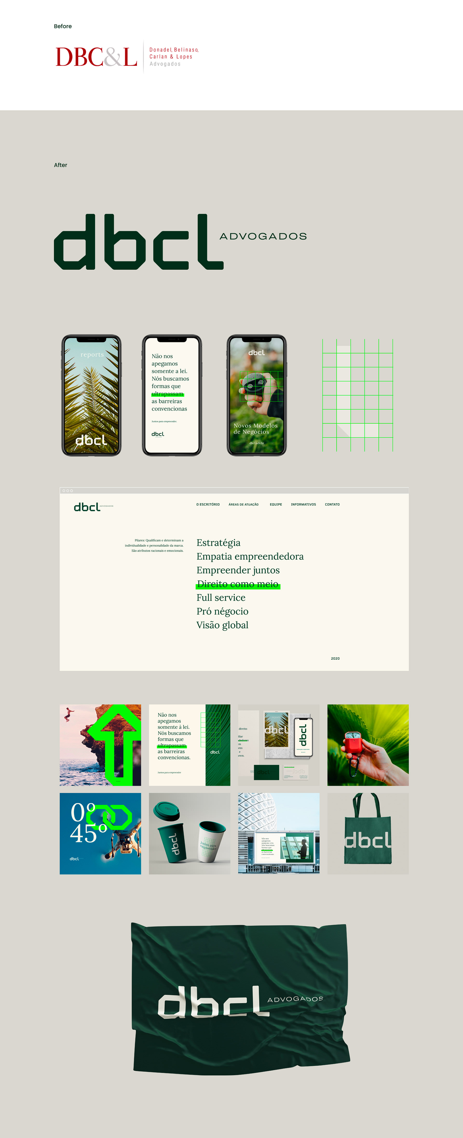 PT O projeto de posicionamento de marca e identidade visual do DBCL Advogados, um escritório de advocacia jovem e inovador com atendimento Full Service. A empresa é formada por empreendedores que buscam tornar a advocacia menos maçante e burocrática, propondo uma nova mentalidade e percepção a esse segmento. São empreendedores com empatia empreendedora, que participam de todas as etapas de geração de valor dos seus clientes e entendem a sua operação de forma holística. Dessa forma, podem prover as melhores decisões jurídicas. Nessa jornada o escritório se propõe a estar junto de seus clientes e colaboradores, se apresentando de uma maneira inovadora, que busca traduzir modernidade, proximidade, força e confiança para se distanciar da abordagem mais tradicional do Direito. A partir da tagline “Juntos para Empreender”, o escritório criou ações e projetos que reforçam a sua essência e sustentam o trabalho de estratégia de marca.