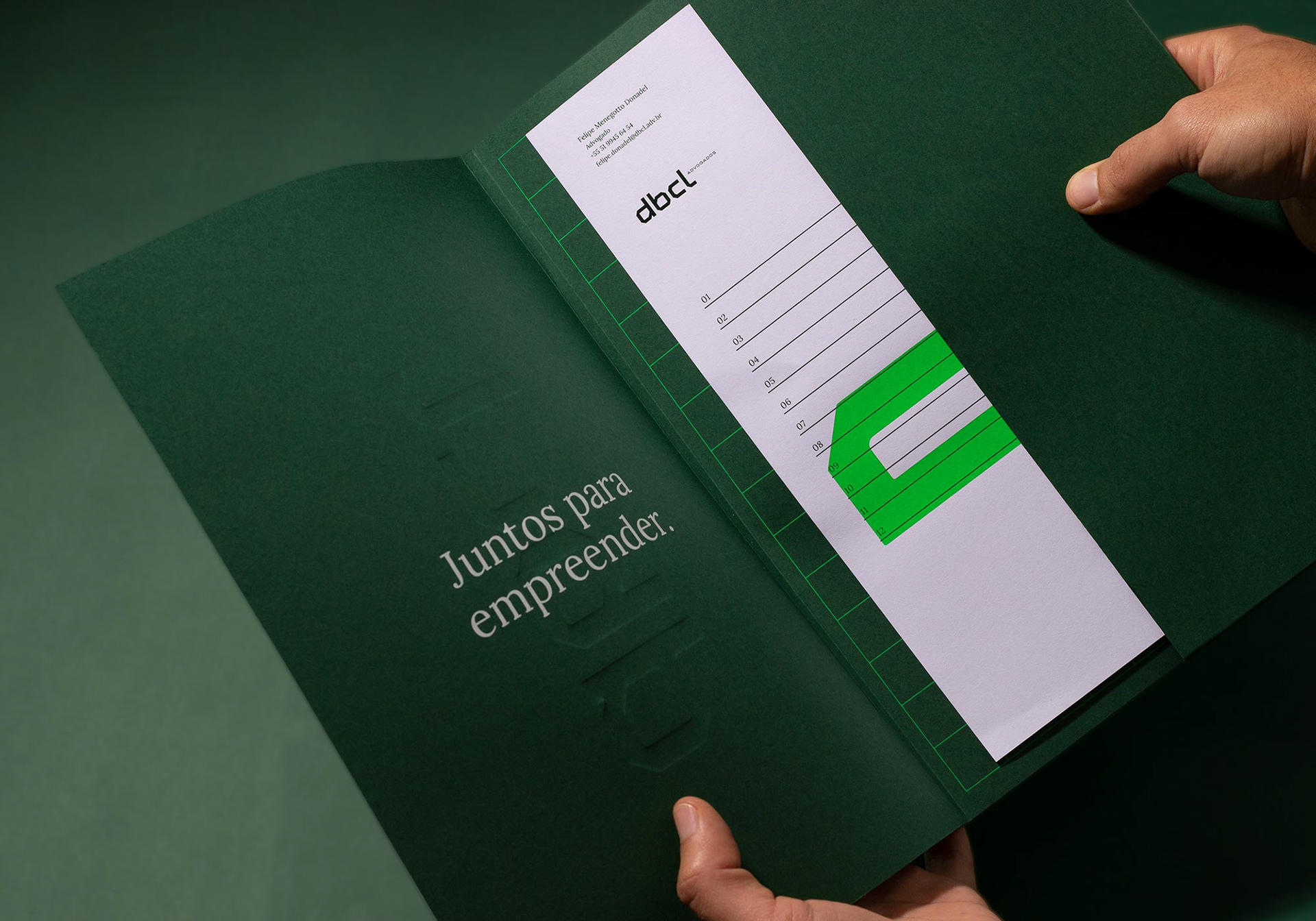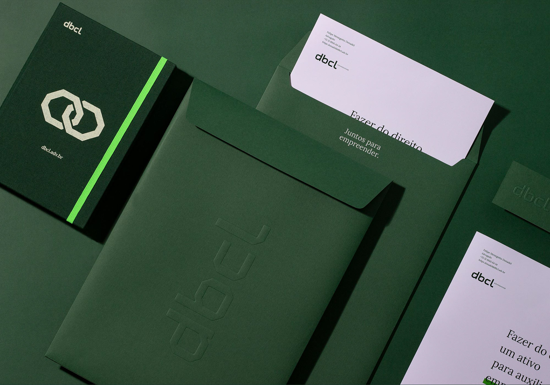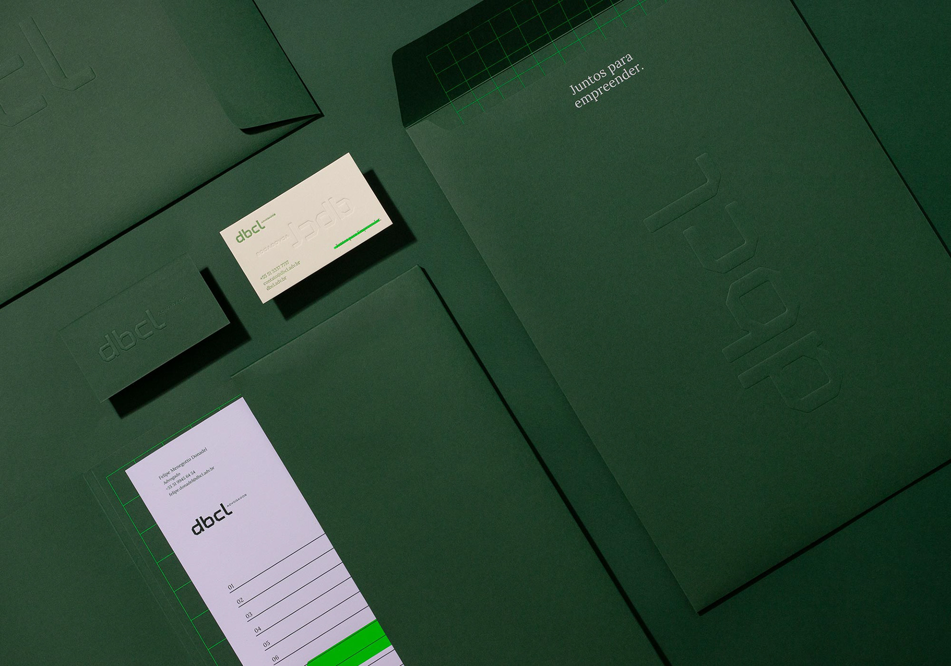 EN DBCL Laywers was a brand positioning and visual identity project. DBCL is a young, innovative and Full Service law firm. The company is formed by entrepreneurs who seek to make the law less boring and bureaucratic, proposing a new mentality and perception about the segment. They are entrepreneurs with entrepreneurial empathy, who participate in all stages of generating value for their customers and understand their operation in a holistic way so they can provide the best legal decisions. In this journey, the firm proposes to be with its clients and collaborators, presenting itself in an innovative way, which seeks to translate modernity, proximity, strength and trust to distance itself from the more traditional approach to Law. Based on the tagline “Together to undertake”, the office created actions and projects that reinforce its essence and support the work of brand strategy.