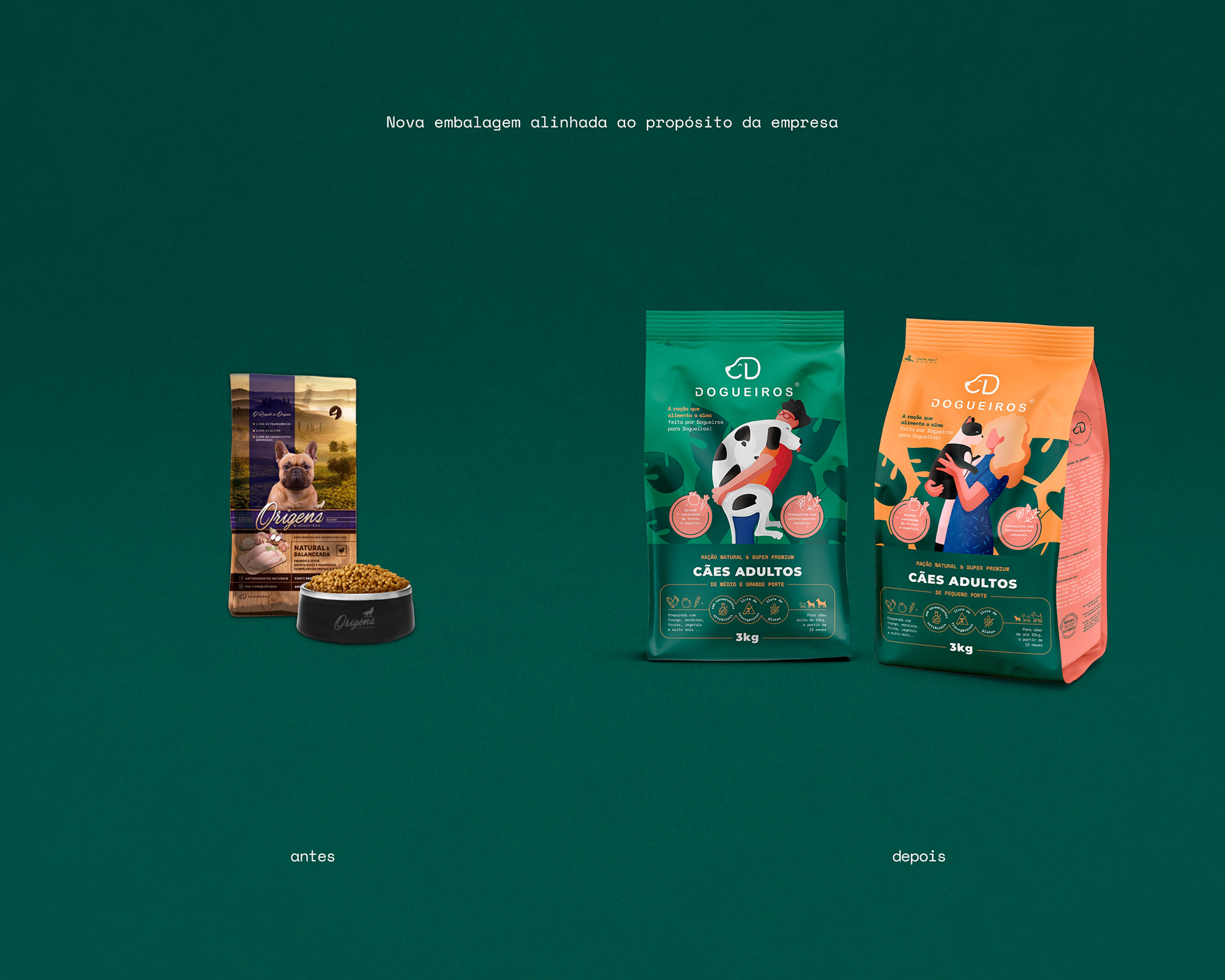 PT O projeto trata do redesenho das embalagens de ração canina para a marca Dogueiros. Após uma reflexão sobre o propósito da empresa e o caminho que a mesma estava tomando, surgiu a necessidade de mudar o posicionamento e a sua apresentação no mercado.