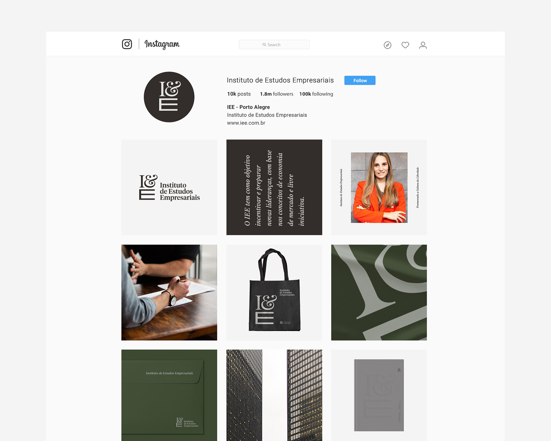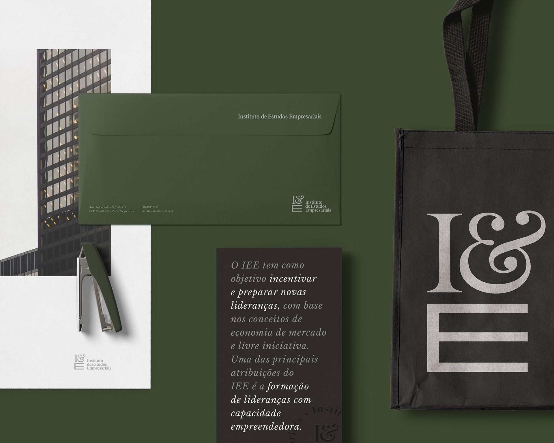 PT O projeto consiste no redesenho da identidade visual de marca do Instituto de Estudos Empresariais, também conhecido por sua sigla IEE. O Instituto tem como objetivo incentivar e preparar novas lideranças com capacidade empreendedora, com base nos conceitos de economia de mercado e livre iniciativa. Uma organização reconhecida por conectar pessoas, instituições e ideias, que é responsável pelo Fórum da Liberdade, e que em 2019 comemorou seus 35 anos de história.